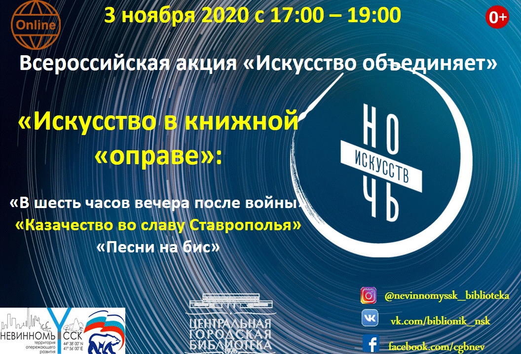 Всероссийская акция «Ночь искусств – 2020» в Центральной городской библиотеке города Невинномысска 3 ноября пройдет в режиме онлайн.