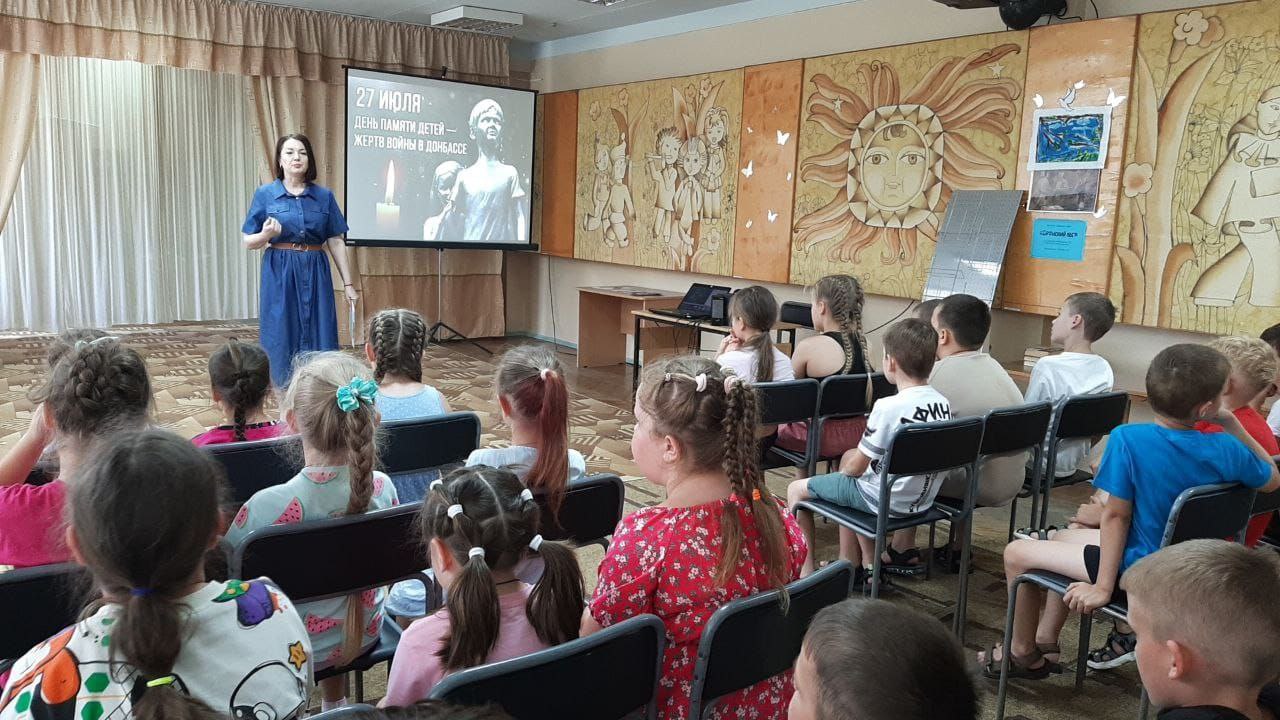 Ребята посмотрели слайд-презентацию «Ангелы Донбасса» и прослушали рассказ о том, что за время боевых действий на территории Донецкой Народной Республики погибли более двух сотен детей.