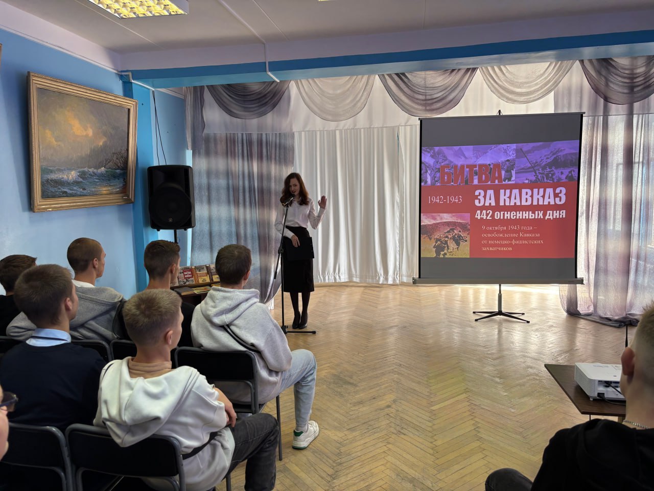 В этот день в отделе обслуживания библиотеки прошёл урок мужества «Героические страницы обороны Кавказа», на котором молодежь не только познакомилась с изданиями по данной теме, но и увидела кадры военной хроники.