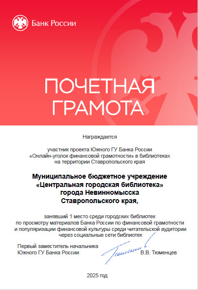 По результатам конкурса Центральная библиотека города Невинномысска заняла почётное 1 место среди библиотек Ставропольского края.